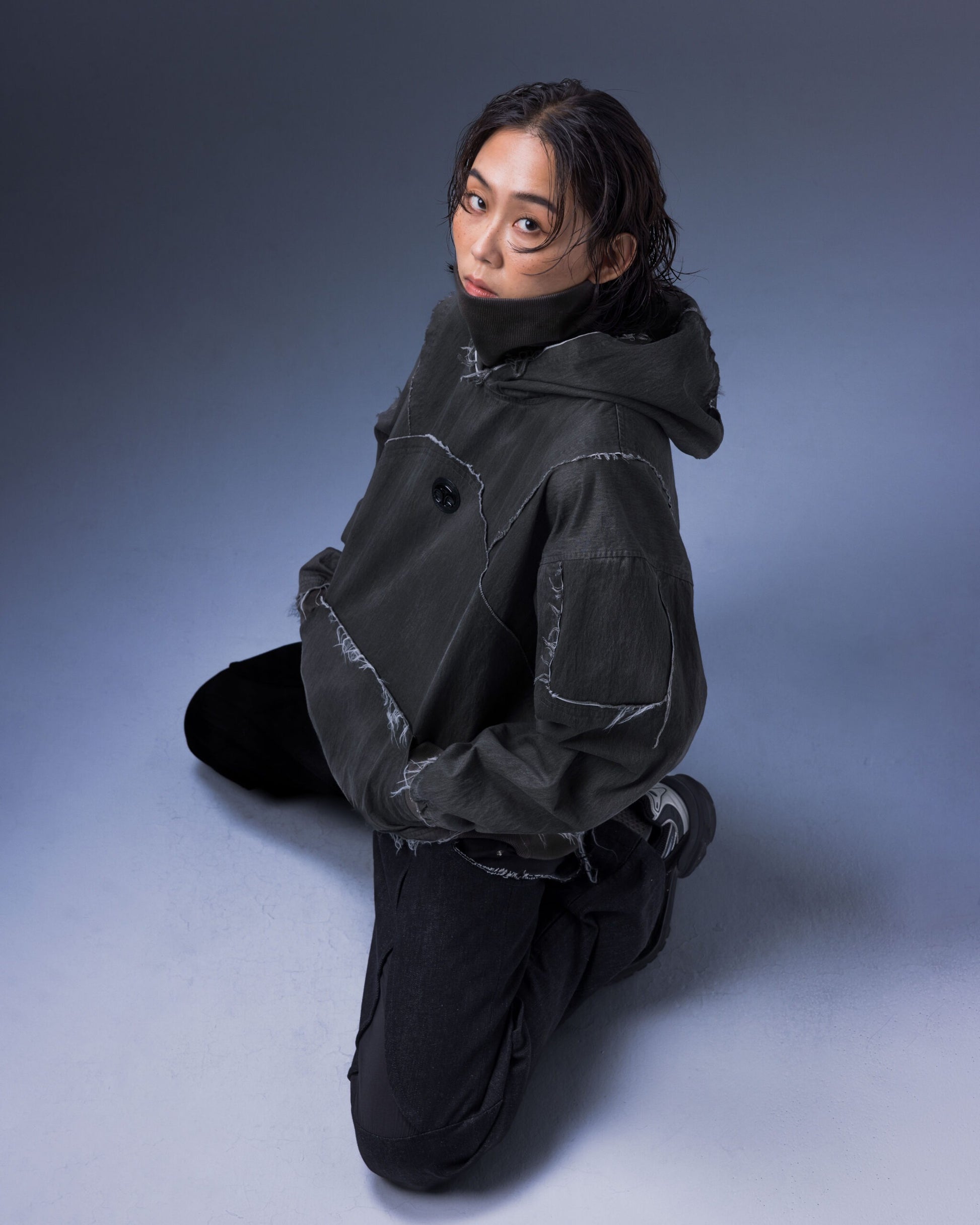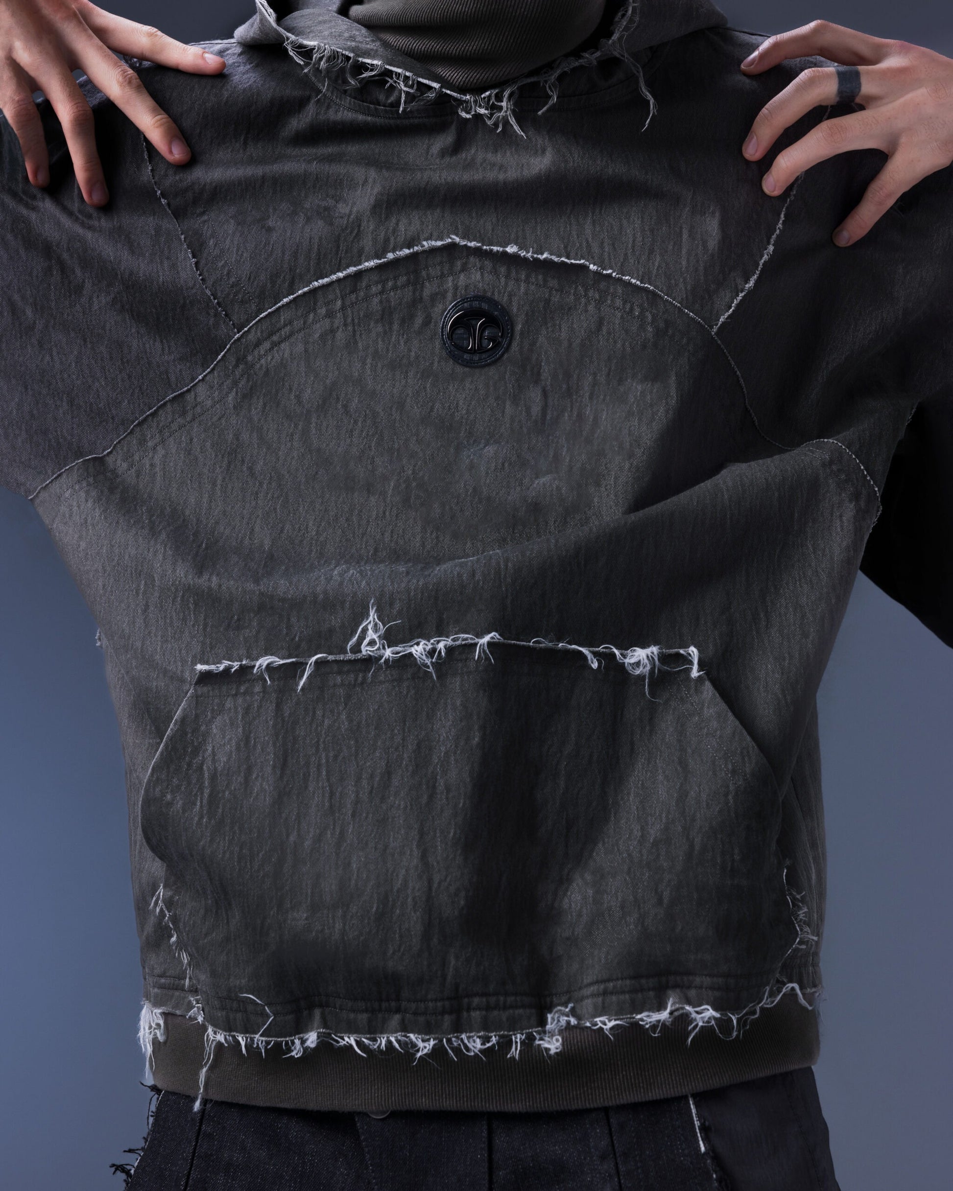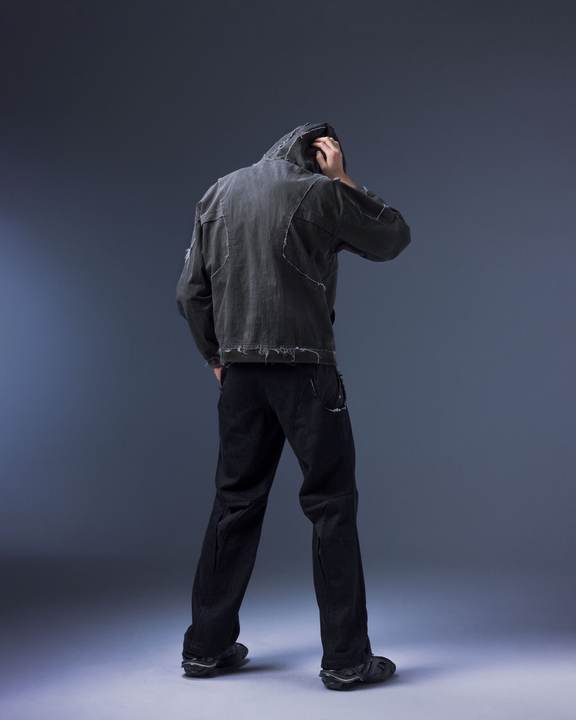 While the outside world imagines rebellion as a desperate roar, Jimmy Gutson interprets "rebellion" as a quiet yet resolute resistance. This top, through its hooded structure, scarf-style high collar, and unfinished design, combines "defense" and "concealment," creating a restrained yet uncompromising rebellious stance.