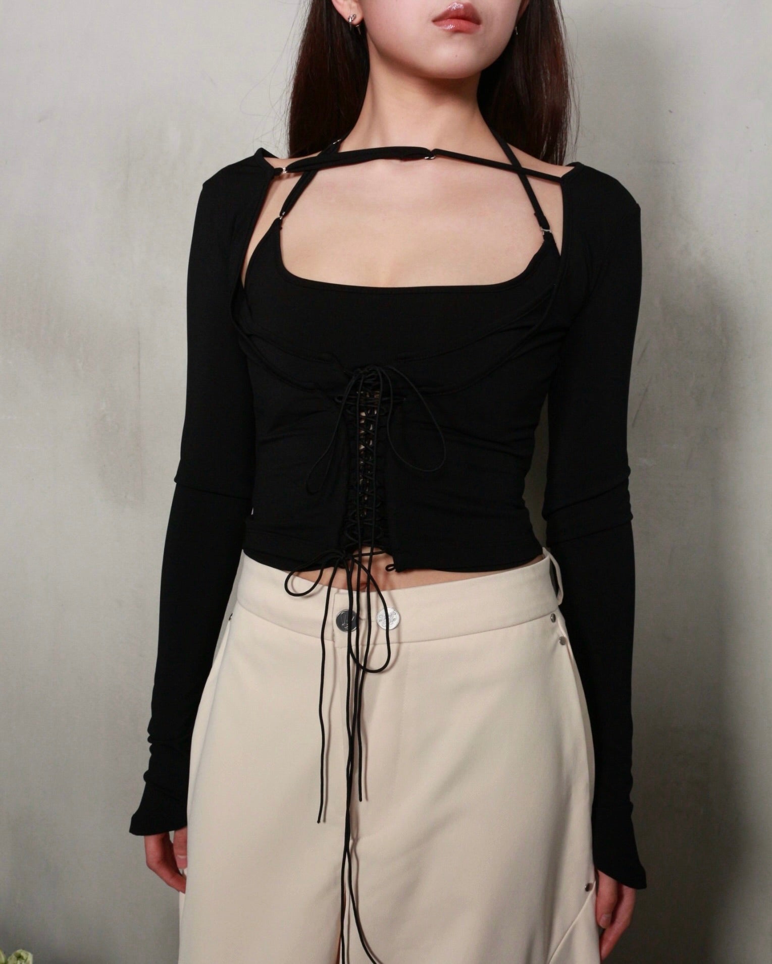 - 兩件式設計,長袖上衣與抹胸內襯