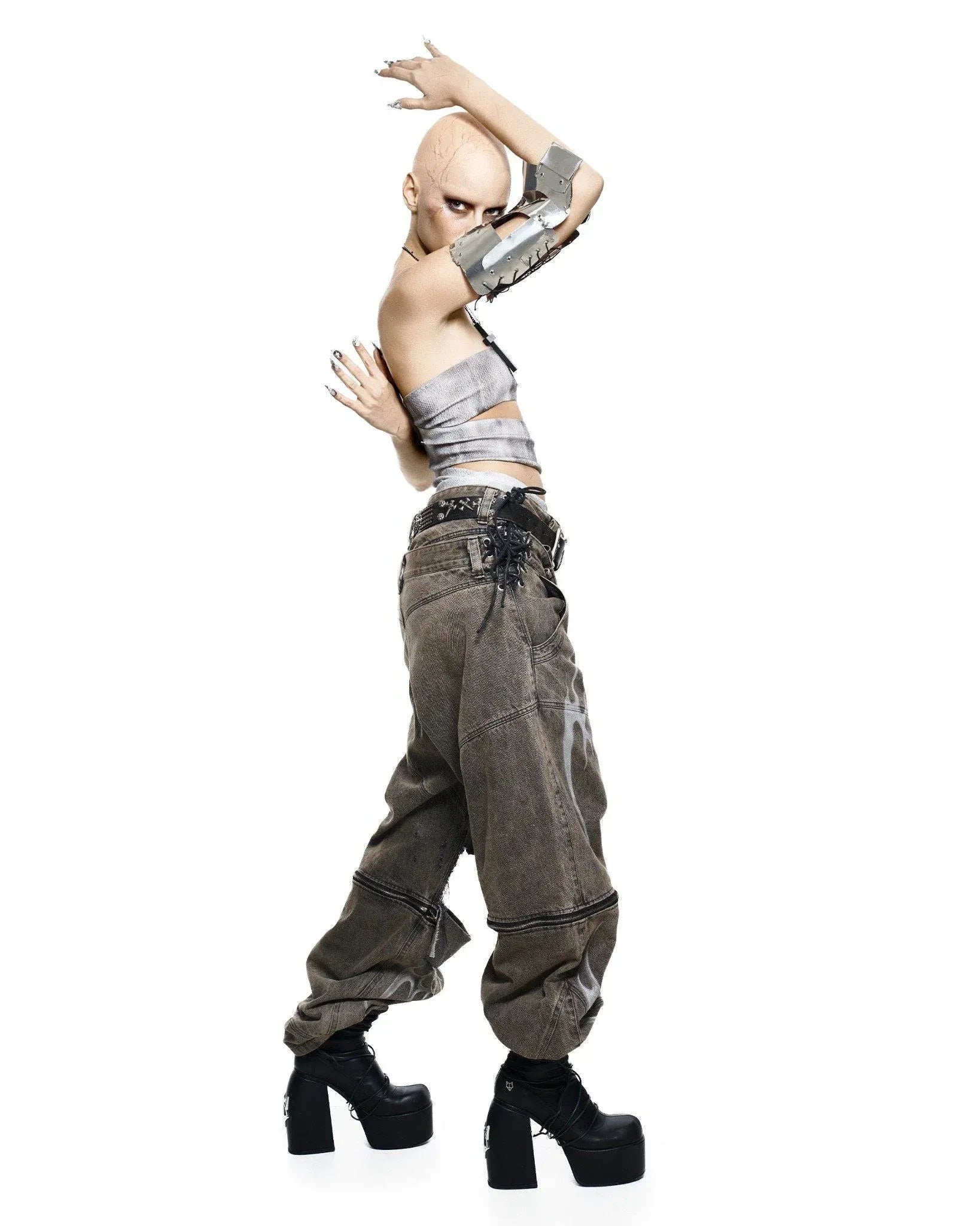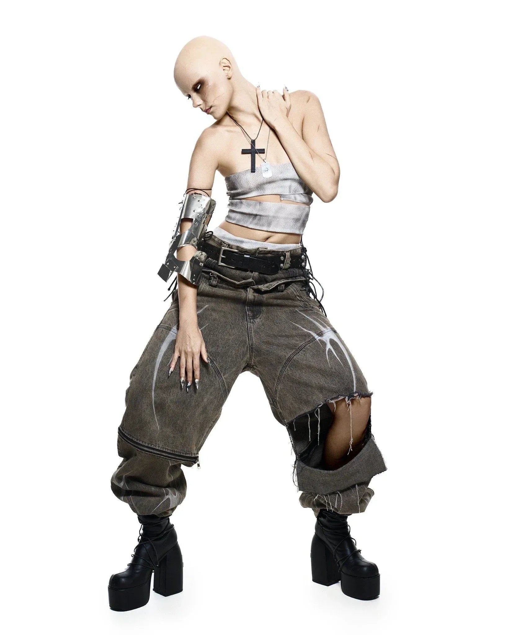 細節:圖案印花、雙腰設計、兩側抽繩、膝蓋破洞