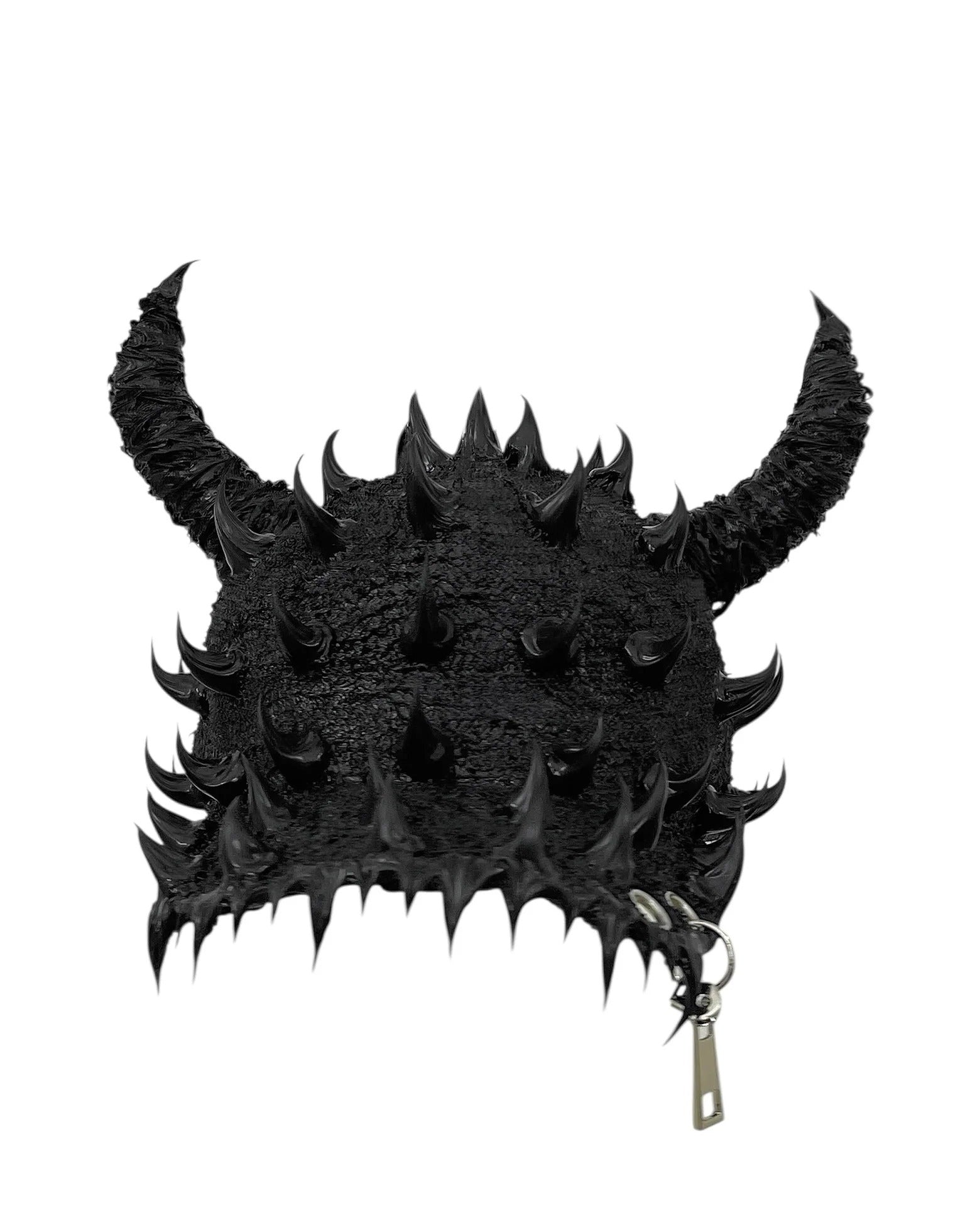牛仔布製成,表面覆蓋黑色矽膠材質,搭配金屬環與獨特拉鍊設計